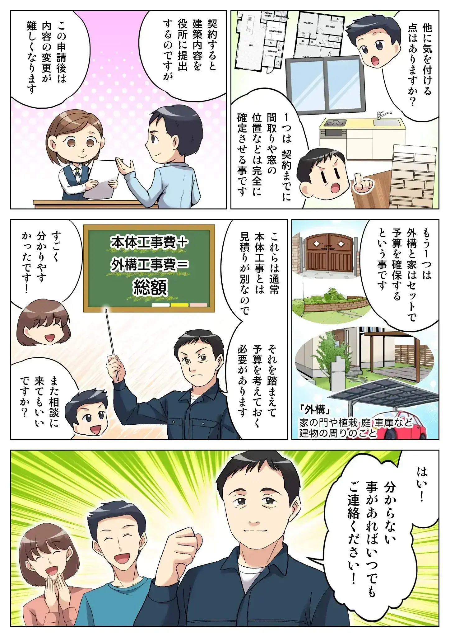住宅本体だけでなく、門や庭、車庫などの外構も含めた予算としましょう。満足のいく家作りのためには家と外構はセットとし、外構はどうするかも事前に考えた上で、本契約へと進んでください。